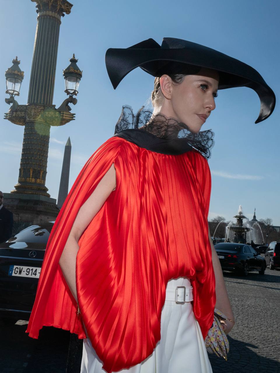 Как рассказала Собчак, для нее разработали специальный график с ежедневной сменой нарядов и причесок. На показе она появилась в алой блузе с плиссировкой и кружевной вуалью, белых кюлотах, мюли с розой и черной треуголке. При этом Собчак подчеркнула, что разные элементы ее образа являются отсылками к знаменитым нарядам из истории моды. К примеру, ее блуза является отсылкой к платью Dior, созданному Ивом Сен Лораном в 1960 году.